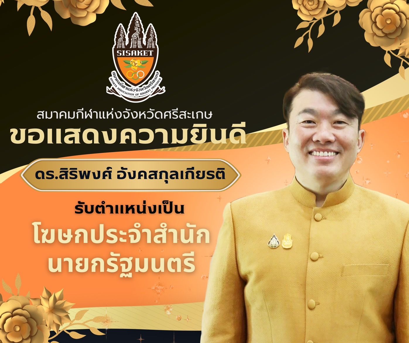 สมาคมกีฬาแห่งจังหวัดศรีสะเกษ ขอแสดงความยินดี ดร.สิริพงศ์ อังคสกุลเกียรติ นายกสมาคมกีฬาแห่งจังหวัดศรีสะเกษ ในโอกาสรับตำแหน่ง “โฆษกประจำสำนักนายกรัฐมนตรี