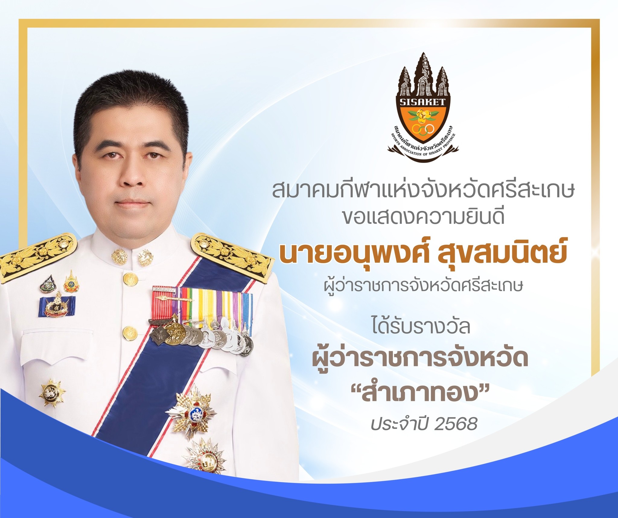 สมาคมกีฬาแห่งจังหวัดศรีสะเกษ ขอแสดงความยินดีกับ ท่านอนุพงศ์ สุขสมนิตย์ผู้ว่าราชการจังหวัดศรีสะเกษ เนื่องในโอกาสรับรางวัล ผู้ว่าราชการจังหวัด “สำเภาทอง” ประจำปี 2568