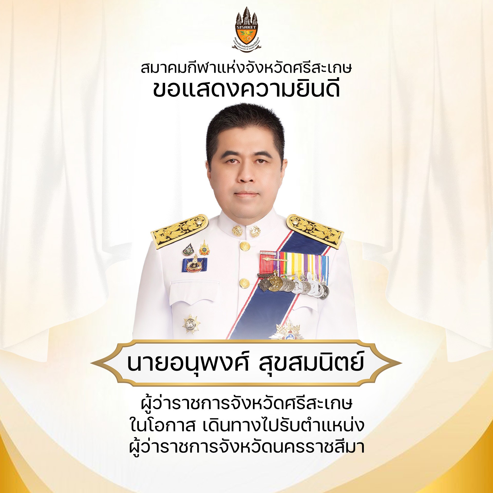 สมาคมกีฬาแห่งจังหวัดศรีสะเกษ ขอแสดงความยินดีกับ นายอนุพงศ์ สุขสมนิตย์ เนื่องในโอกาส เดินทางไปรับตำแหน่งผู้ว่าราชการจังหวัดนครราชสีมา